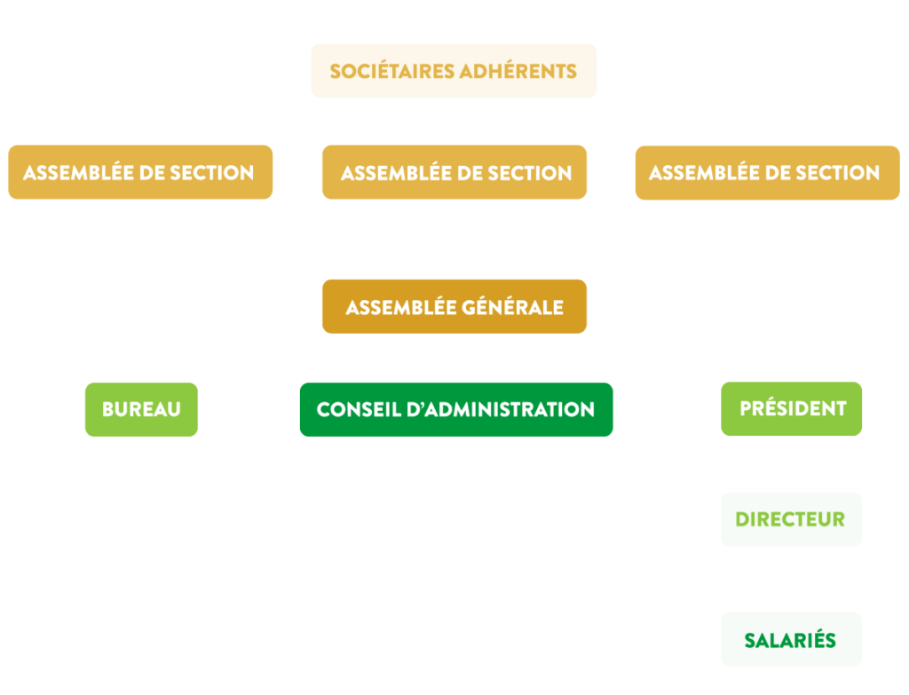 Basé sur le fondement unique et inaltérable de la coopération, tous les Sociétaires Adhérents, à part égale et quel que soit leur apport au capital, sont décideurs grâce au système démocratique : le principe même d’un Sociétaire Adhérent = une voix.